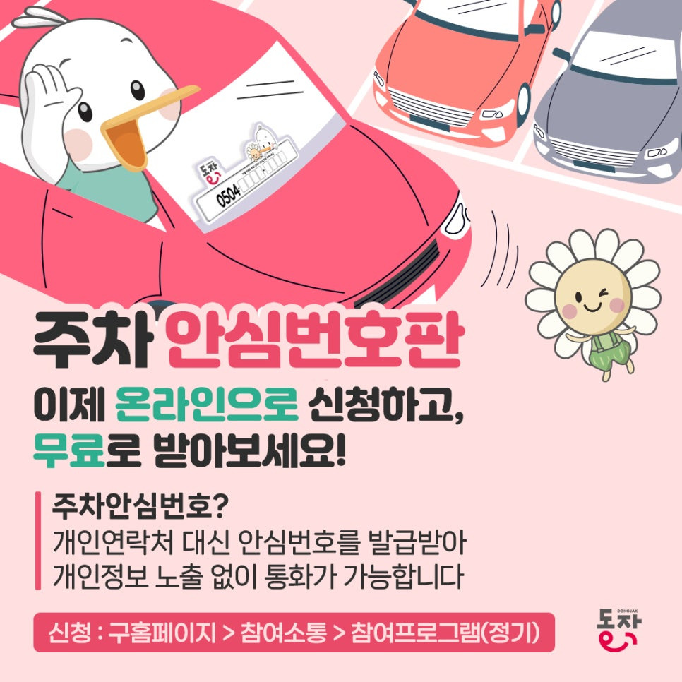 이 서비스는 현재 동작구에 거주하는 주민이라면 누구나 사용할 수 있으며, 동작구 홈페이지를 통해 간단하게 신청할 수 있습니다. 신청 후, 동작구의 캐릭터 '동작이와 국화씨'가 그려진 주차안심번호판이 무료로 배송되며, 해당 번호판을 차량에 부착해 사용할 수 있습니다.
