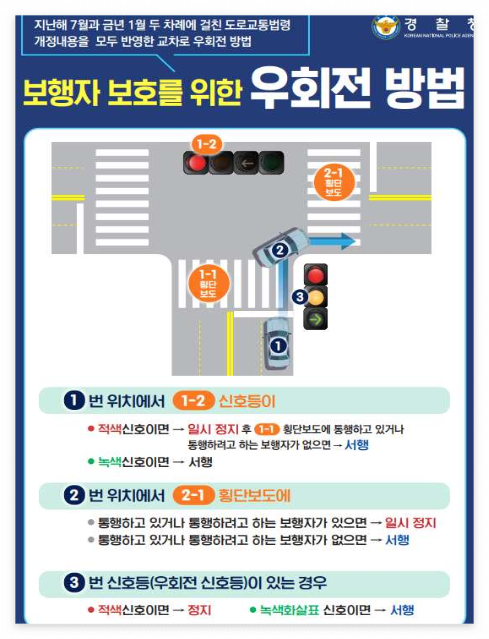 도로 위의 모든 이용자는 서로를 보호할 의무가 있습니다. 새로운 교차로 우회전 방법은 바로 이 원칙을 강화하기 위해 마련되었습니다. 내일부터 시작되는 이 규칙을 철저히 지켜, 보다 안전한 운전 환경을 조성합시다. 보행자와 운전자 모두의 안전을 위해 우리 각자가 책임감을 가지고 규칙을 준수하는 것이 중요합니다.