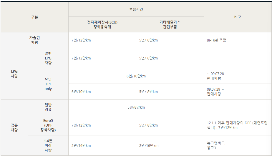 특히 전자제어 장치와 정화용 촉매의 경우 7년 또는 12만 km까지 보증이 제공되며, 이는 기아차의 환경 보호 의지를 보여줍니다.
