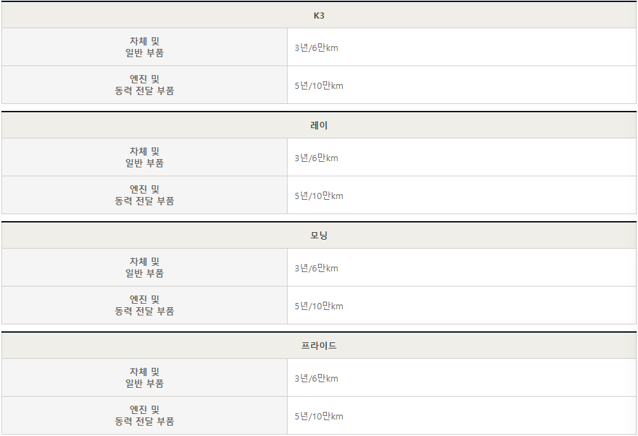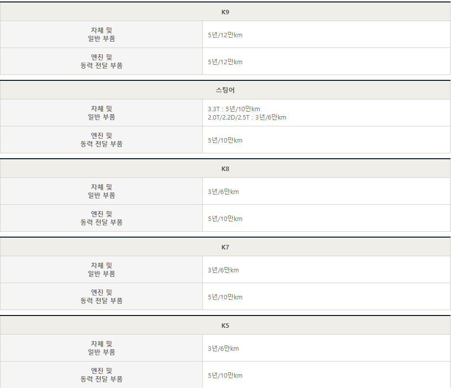 기아자동차의 일반 차량 보증은 크게 두 가지로 나뉩니다. 차체 및 일반부품, 엔진 및 동력 전달 부품입니다.