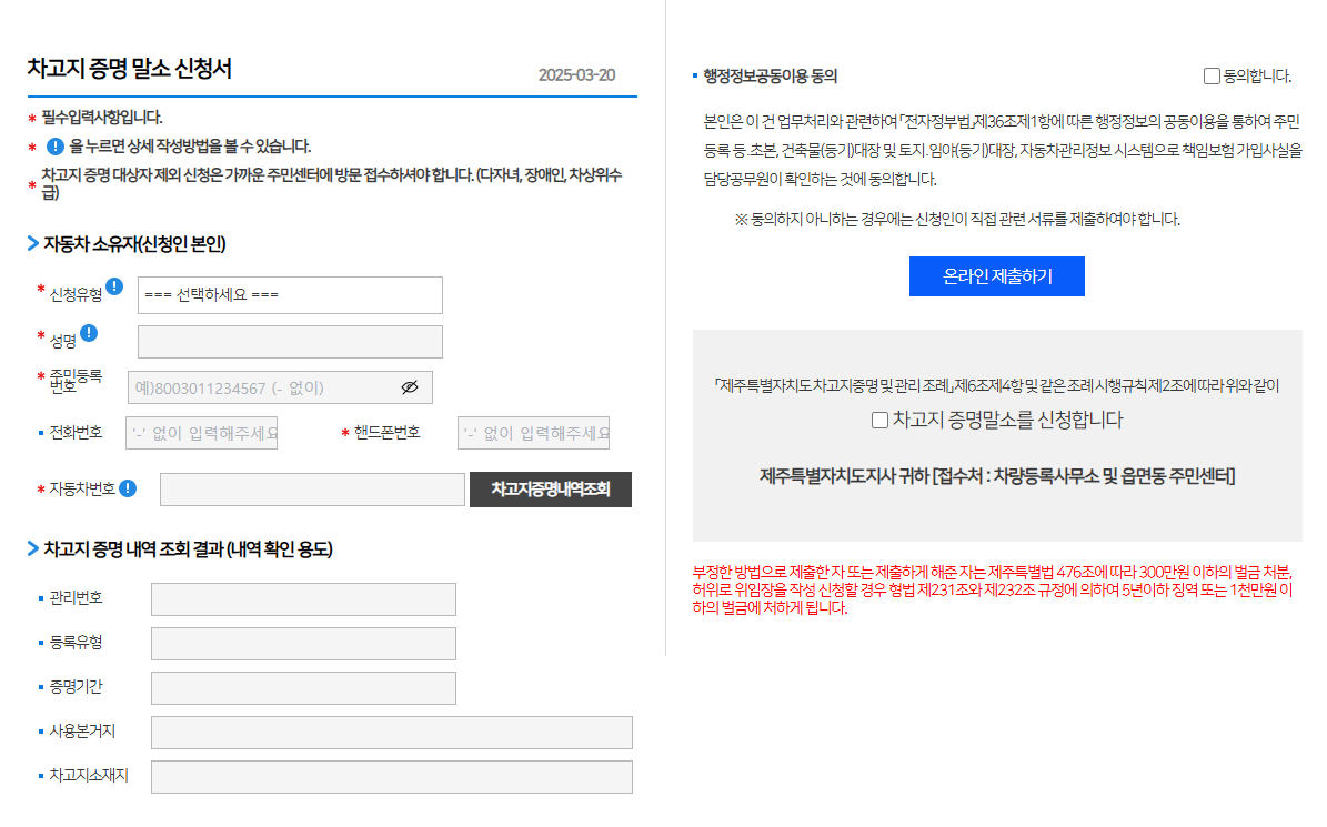 - A. 제주특별자치도 포털사이트에서 "제주 차고지증명제"를 검색해 신청할 수 있습니다.