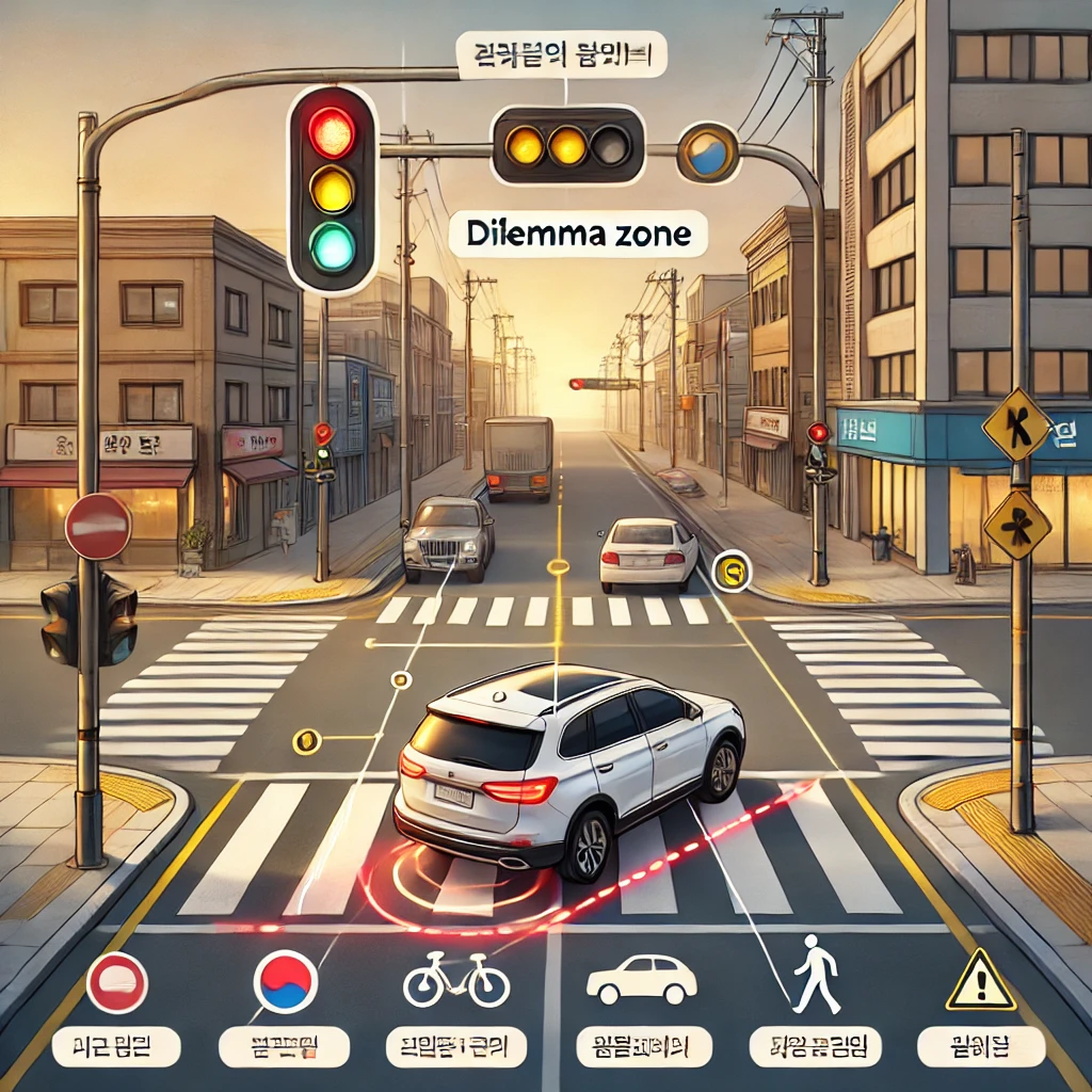 "딜레마 존(Dilemma Zone)"은 황색 신호가 켜졌을 때 운전자가 급정거하자니 위험하고, 그냥 가자니 위반될까 불안한 거리대를 말합니다.