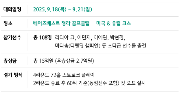 2025 하나금융그룹 챔피언십이 오는 9월 18일(목)부터 21일(일)까지 인천 청라 베어즈베스트 골프클럽에서 개최됩니다.