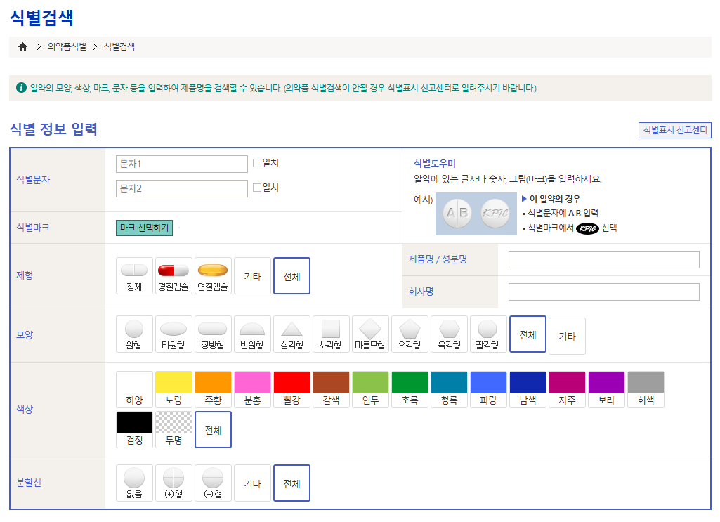 ‘약 이름’, ‘모양’, ‘색상’, ‘식별 문자’로 검색 가능한 매우 유용한 서비스입니다.