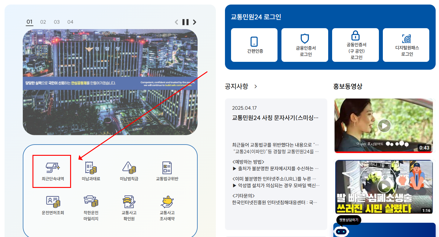 - 하위 메뉴 중 ‘최근 단속내역’ 선택